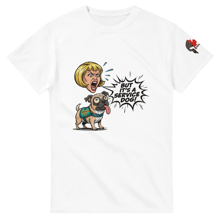 Show off your sense of humor with our Funny Dog T-Shirt, featuring a playful design of a comically unfit service dog and its owner shouting, "This is a service dog!" This shirt is perfect for dog lovers who appreciate a good laugh and want to make a statement about the importance of proper service dog training.
